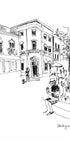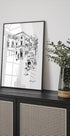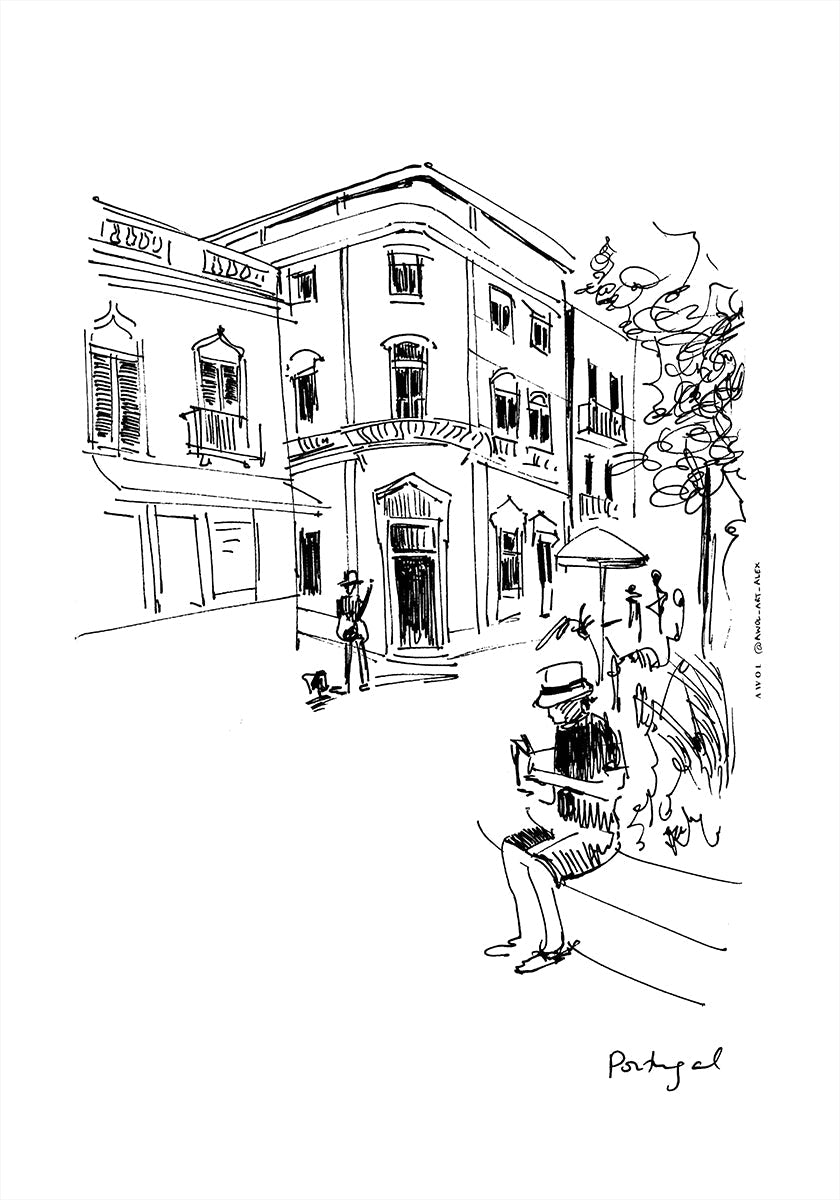 En rolig portugisisk sommermorgen fanget i sort-hvid: en lys byplads med gamle facadehuse, en rislende fontæne og et hjørnecafé, hvor turister og lokale passerer forbi. En gademusiker med hat giver scenen liv, mens minimalistiske streger indrammer arkitekturen. Af Awol Art Alex. En hyldest til rejseglæde og urban poesi.
