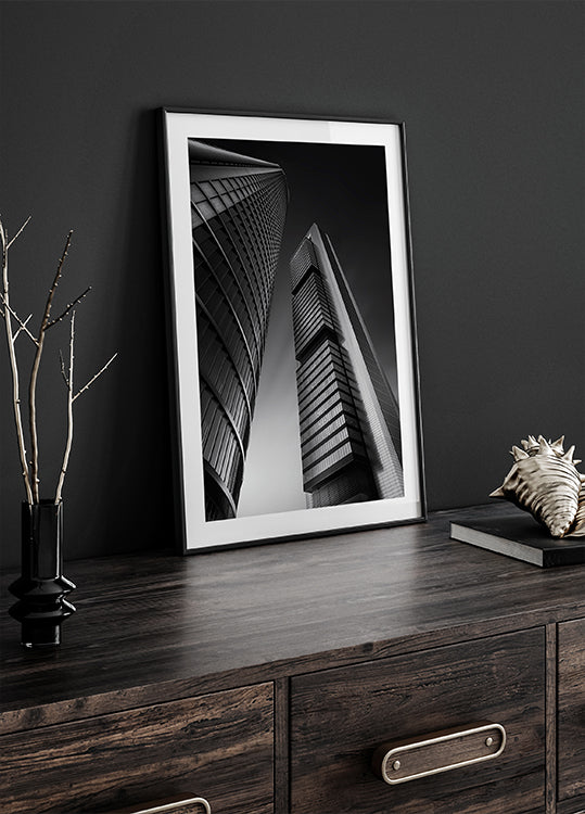 Together af Jorge Ruiz Dueso indfanger en natlig scene fra Madrid, hvor månen svæver over byens skyline. Set i dramatisk perspektiv strækker to moderne bygninger sig mod himlen, deres rene linjer og geometriske rytme skaber ro og spænding på én gang. Perfekt til elskere af arkitektur og spansk nattestemning.