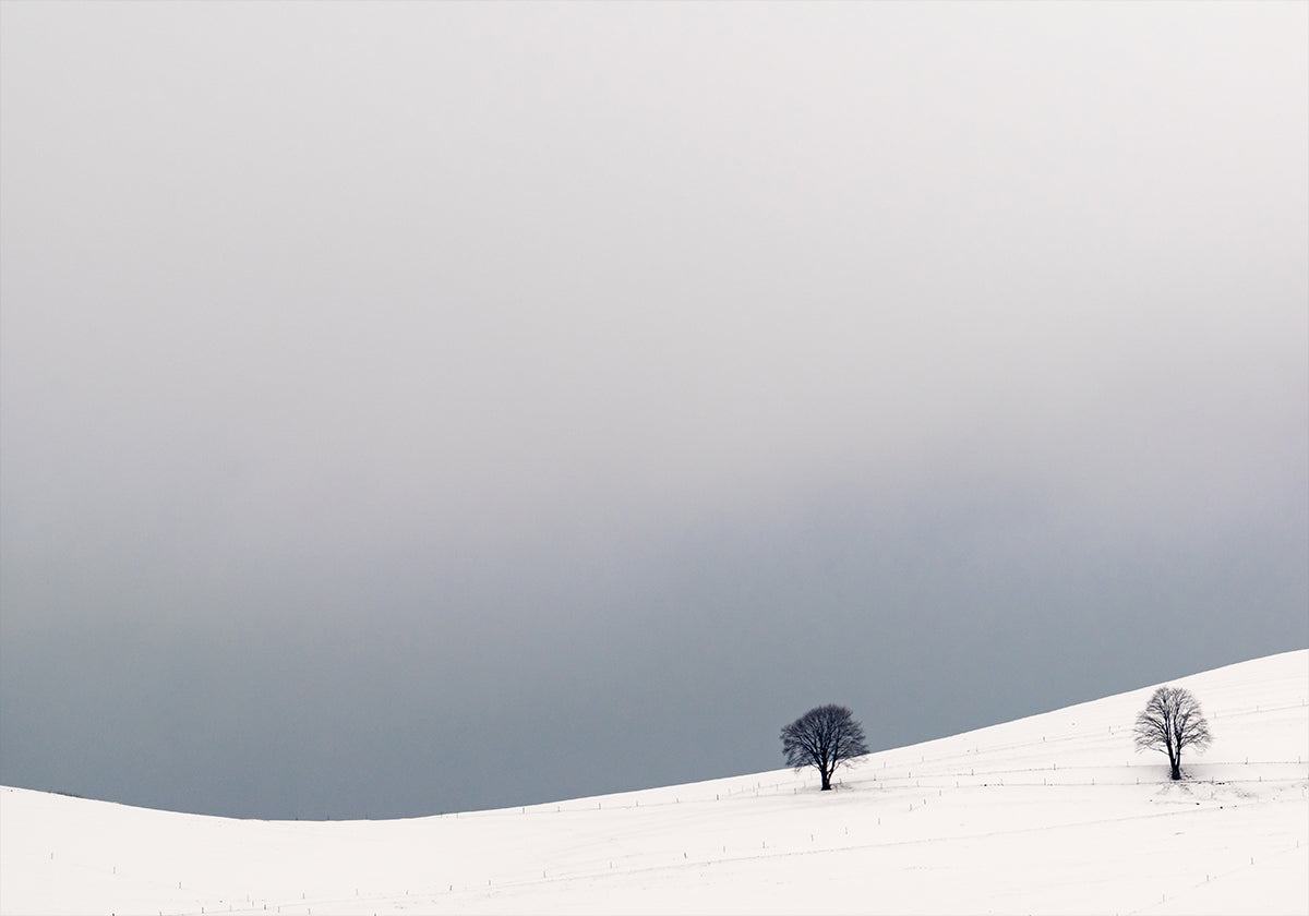 „Two Alone“ von Hugh Warren fängt die Stille eines verschneiten Tals ein: sanfte Hänge, ein Zaun und zwei einsame Silhouetten in der Ferne, zusammengehalten im Weiß. Dunkle Bäume rahmen die Szene ein und lassen die Tiefe des Waldes erahnen, während das gedämpfte Licht dem Motiv eine poetische Ruhe und ein Gefühl von zeitlosem Winter verleiht. Ein Motiv, das von Ruhe und Präsenz spricht.