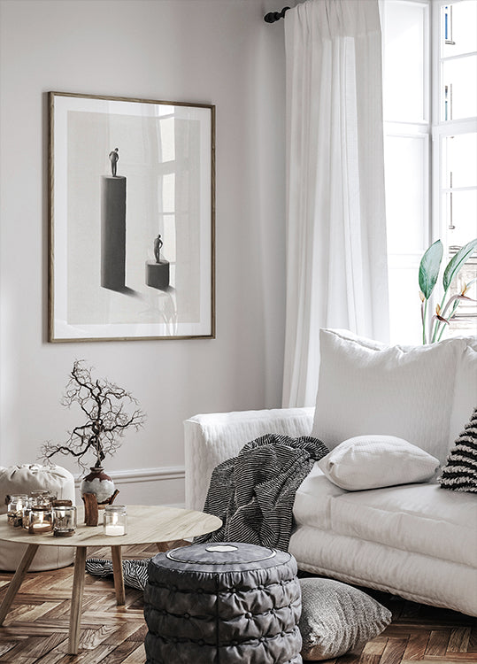 Ein zum Nachdenken anregendes surrealistisches Kunstwerk, das zwei kleine menschliche Figuren zeigt, die auf unterschiedlichen zylindrischen Sockeln in unterschiedlicher Höhe stehen. Eine Figur blickt von einer höheren Plattform nach unten, während die andere nach oben blickt, und veranschaulicht so Themen wie Ungleichheit, Privilegien und soziale Hierarchie. Das minimalistische Graustufendesign verstärkt den symbolischen Ausdruck des Werks und macht es zu einem starken visuellen Kommentar zu Status, Ambition und Perspektive. Perfekt für moderne, konzeptionelle und minimalistische Kunstsammlungen.
