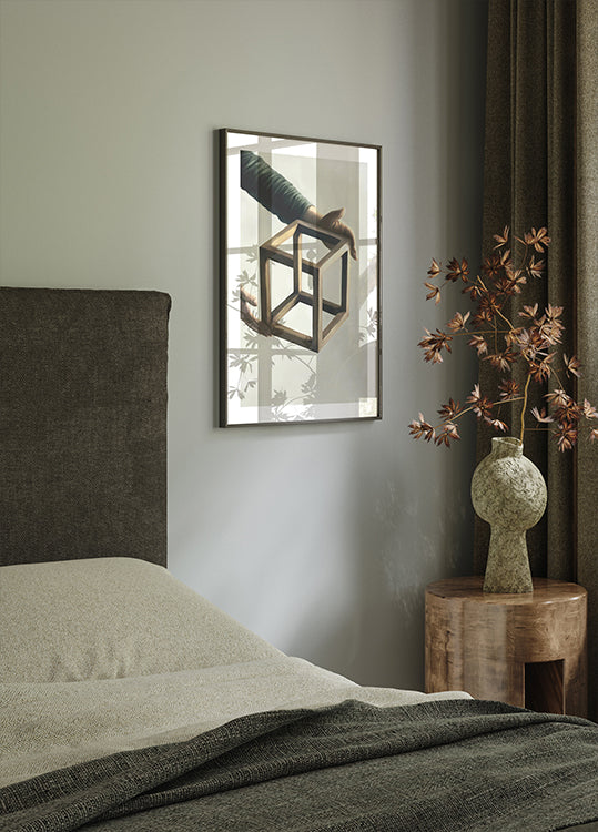 Ein schlichtes und faszinierendes Kunstposter mit einem unmöglichen Würfel. Die warmen Farbtöne und die optische Täuschung erzeugen ein spannendes visuelles Paradoxon in einem ruhigen Ausdruck.