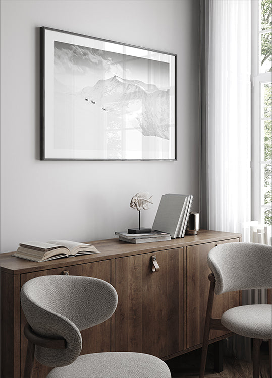 En lys, minimalistisk scene fra Sunnmørsalpene i Norge: en række små silhuetter af vandrere og skiløbere bevæger sig i kø langs en snedækket kam mod en fjern top. De fine linjer og det høje lys skaber et grafisk, næsten vægtløst udtryk. Fotografi af Åsmund Keilen. Kontrasten mellem det hvide snelandskab og de mørke figurer giver dybde og ro.