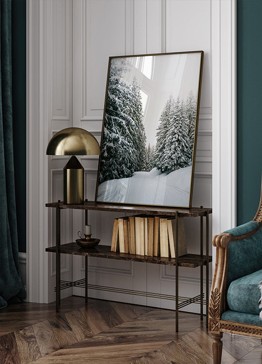 Poster Schneebedeckte Straße durch immergrünen Wald