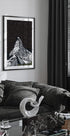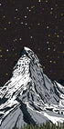 Ein schneebedeckter Berggipfel erhebt sich steil vor einem tiefen, sternenübersäten Nachthimmel. Klare, minimalistische Linien und eine zentrierte Komposition sorgen für Ruhe und Ausgeglichenheit, während am Horizont kühle Blautöne auf warme Farbtöne treffen. Ein stilisierter Wald im Vordergrund rundet die alpine, verträumte Stimmung ab. Perfekt für Ruhe im Wohn- oder Schlafzimmer.