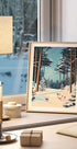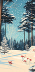 Eine friedliche Winterillustration eines verschneiten Waldes mit hohen Kiefern und fallenden Schneeflocken. Rote Beeren verleihen der ruhigen Landschaft eine festliche Note und eignen sich perfekt für Weihnachts- und Winterdekorationen.