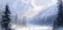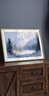 In sanften Pinselstrichen entfaltet sich eine verträumte, schneebedeckte Landschaft: stille Pinien, weiße Felder und ein Himmel in kühlen Blautönen, an dem leichte Schneeflocken tanzen. Ein Hauch von goldenem Abendlicht erzeugt Tiefe und Wärme. Das Motiv versprüht winterliche Ruhe, nordische Poesie und eine dezente Weihnachtsstimmung – perfekt für gemütliche Räume.