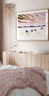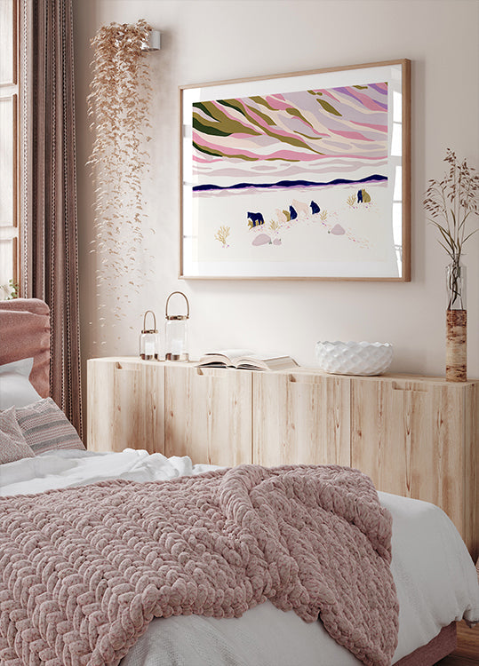 Eine dramatische Winterlandschaft in gedämpften Marine-, Rosa- und Lilatönen, in der ein Rudel Wölfe bei einem ruhigen Sonnenuntergang durch den Schnee in Richtung entfernter Berggipfel zieht. Die Gouache-Illustration von Julie Lesouef vereint Kraft und Poesie und verleiht dem Raum ein Gefühl von Ruhe, Wildheit und nordischem Zauber. Eine stimmungsvolle Wandkunst, die zum Nachdenken einlädt.