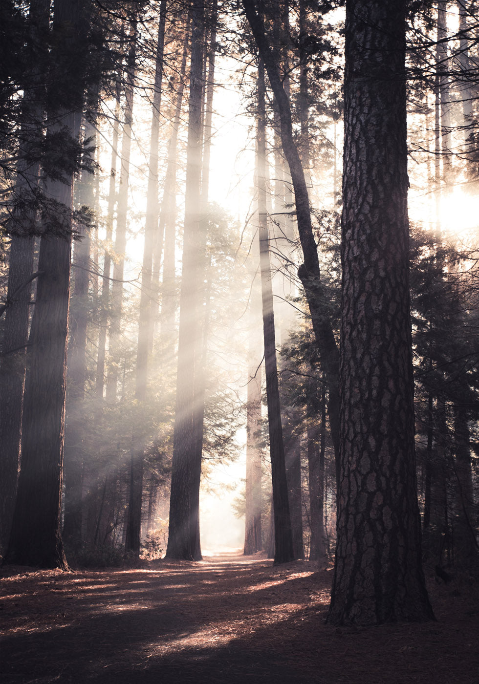 Eine atemberaubende Waldszene aus dem Yosemite Valley, wo die Morgensonne durch die hohen Bäume scheint und eine ruhige und geheimnisvolle Atmosphäre schafft. Perfekt für Naturliebhaber und alle, die sich eine entspannende Inneneinrichtung wünschen.